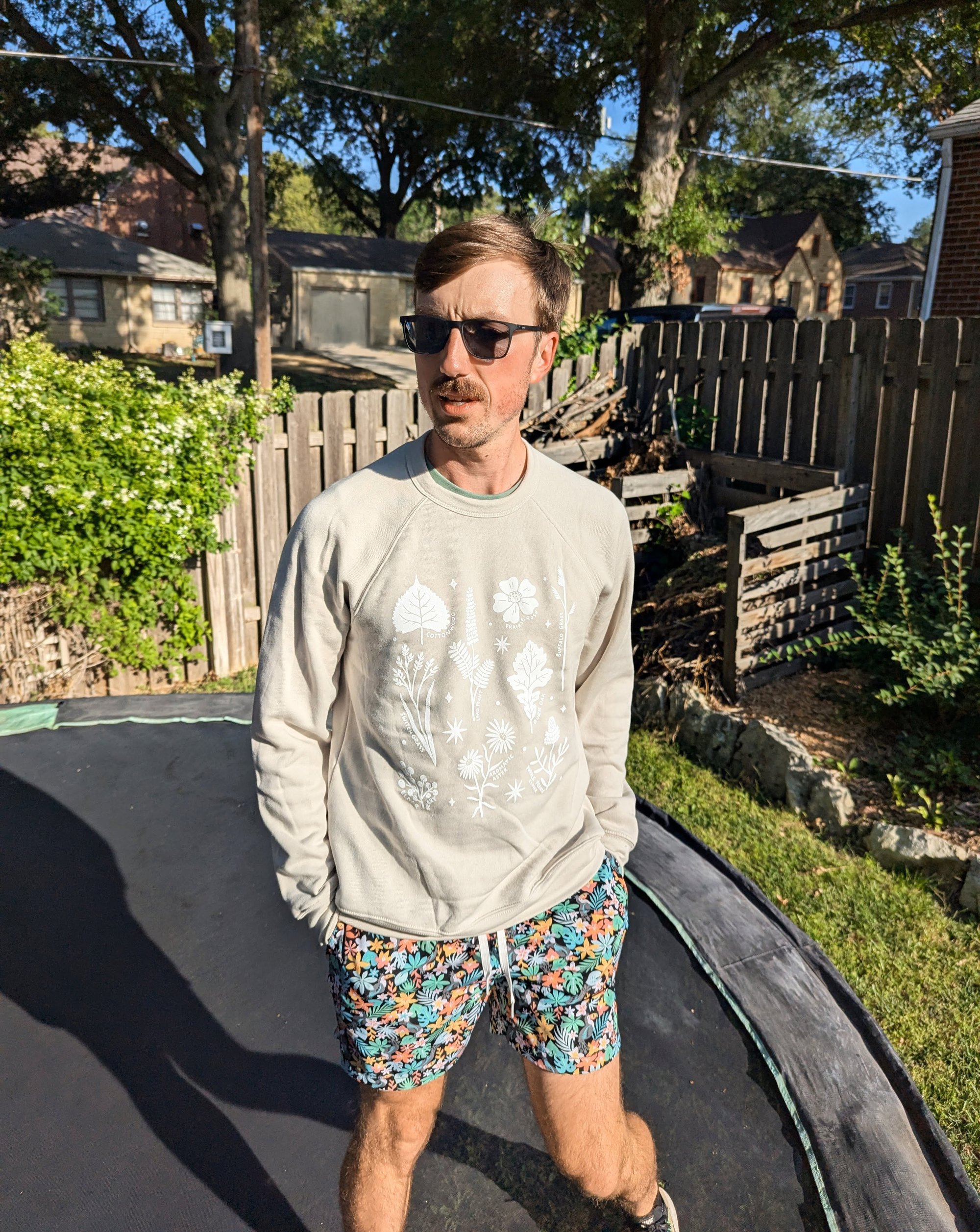 Bella+Canvas, white ink on a light tan/cream (heather dust) sweatshirt, midweight and unisex. Tri-blend material. Printed in Lincoln, Neb.